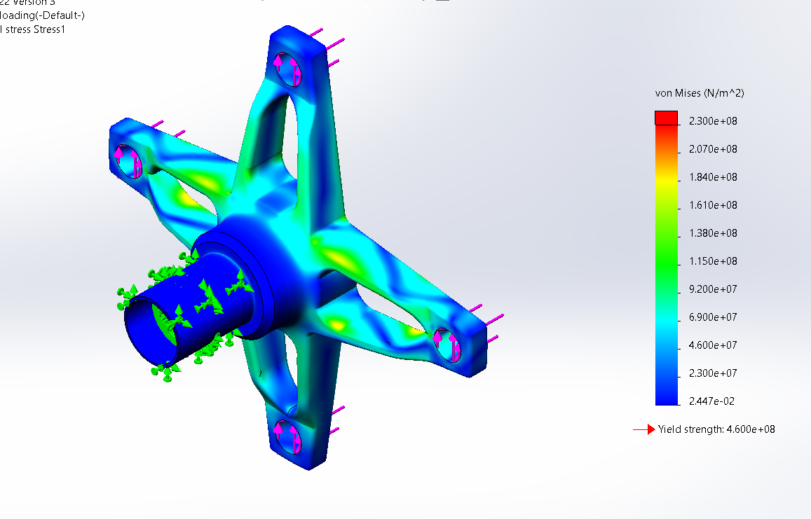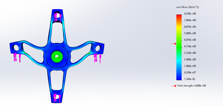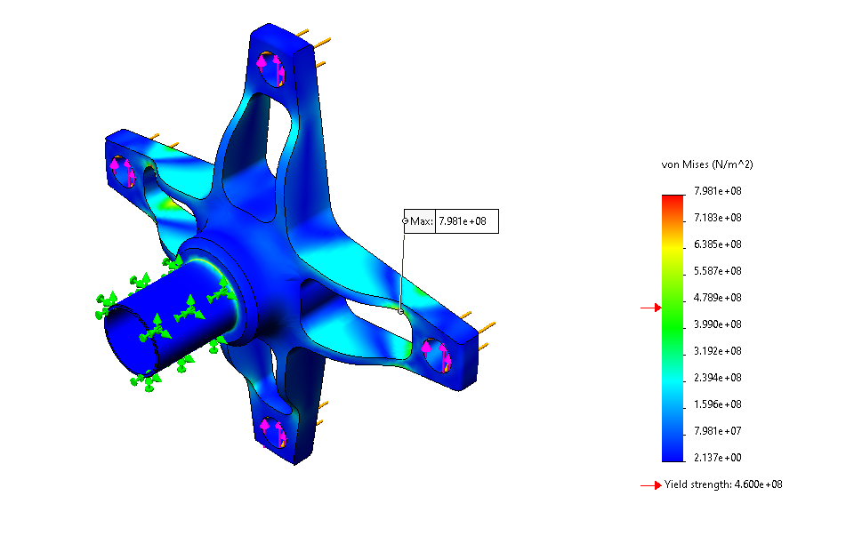 This result showed points on the hub where the material would permanently deform (yield) above an acceptable rate (Young’s Modulus of AISI 4130, in this case 460 MPa). If we were to remanufacture the hubs w/ the same material we would surely break all of them.
