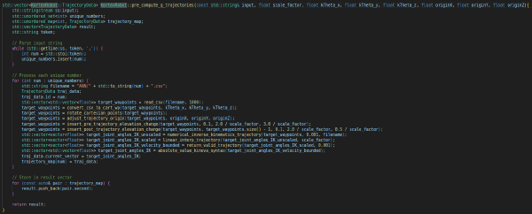I had a kinematics library available to me from my prof Matt Pan’s time at Disney Research, so I had some options at my disposal. I used the pseudo-inverse Jacobian method to generate smooth trajectories before runtime. The way it works is basically by taking current joint angles, performing forward kinematics to get current position, calculating the difference between the current position and the target position, and using the Jacobian to convert the cartesian difference into joint space difference and applying that joint space difference to the robot’s current joints. This procedure is repeated three to four times until the euclidian error between the algorithm’s solved position and target position is small.