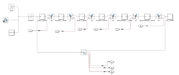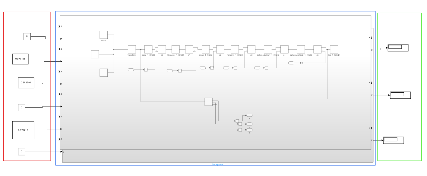 Aside from doing the inverse kinematics for you, Simulink also gives you a 3D representation of the manipulator pose. It was really cool to see the model moving around for different joint inputs.