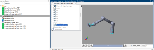 MATLAB takes your physical CAD model and converts it into a use-able simulator. It generates the transforms between linkages automatically using your Solidworks mates and allows you to input joint angles and output cartesian coordinates.